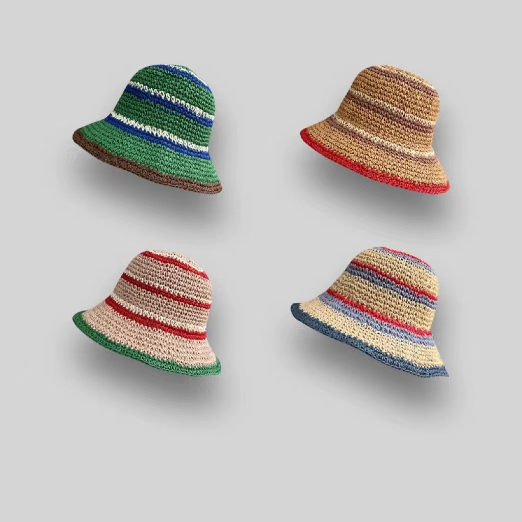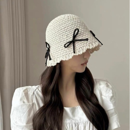 韓国版ins風蝶結び女性春夏ファッション甘い旅行日よけニット帽草編み漁師バケツ盆帽