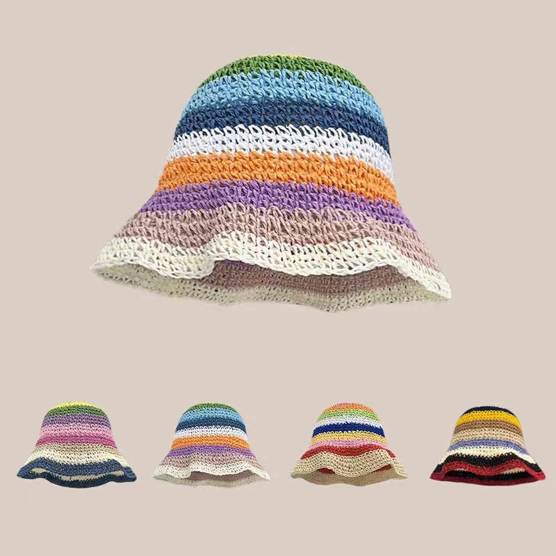 夏の韓国の日よけ帽子の海辺の日よけ帽子の子供の小さい清新な編み物の漁師の帽子の虹の手作りの麦わら帽子