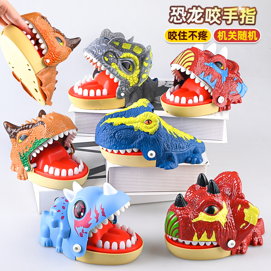 子供が手をかむおもちゃは指を噛んで大きい口の恐竜の柔らかいゴムを抜いて歯を抜きます。