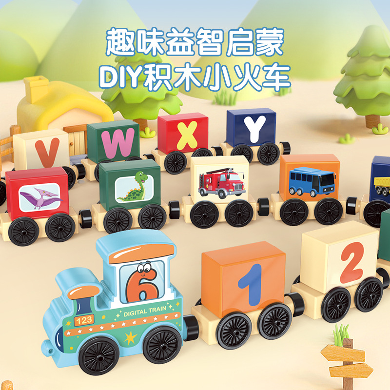 子供の組み合わせの数字の小さい列車の連体はアルファベットの自動車の恐竜の益智を引きずって認知の積み木のおもちゃの車を発見します。
