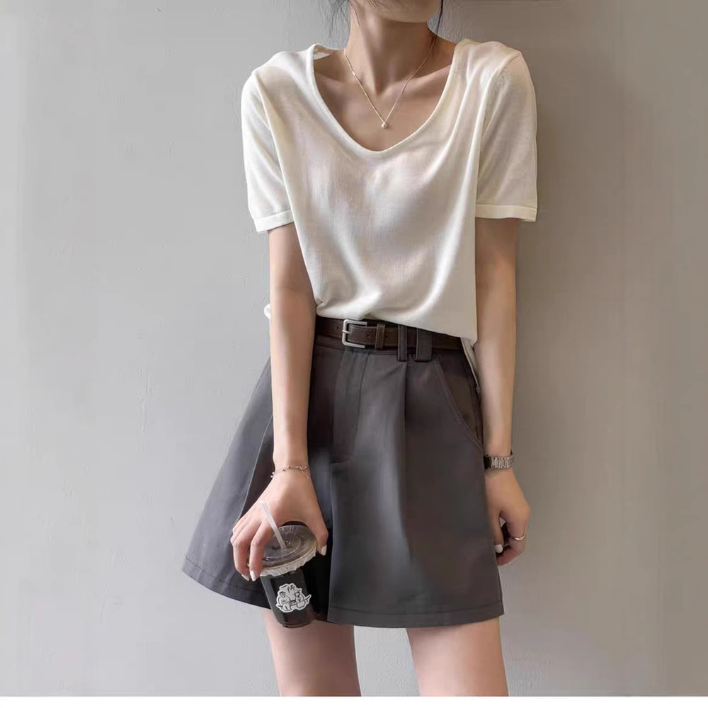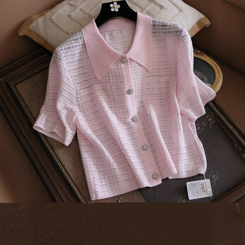 知的ポロカラーのパール光沢のある軽い高級感のあるヘビーデューティーポイントダイヤモンドホワイトリッチシリーズアイスシルクニット半袖トップ