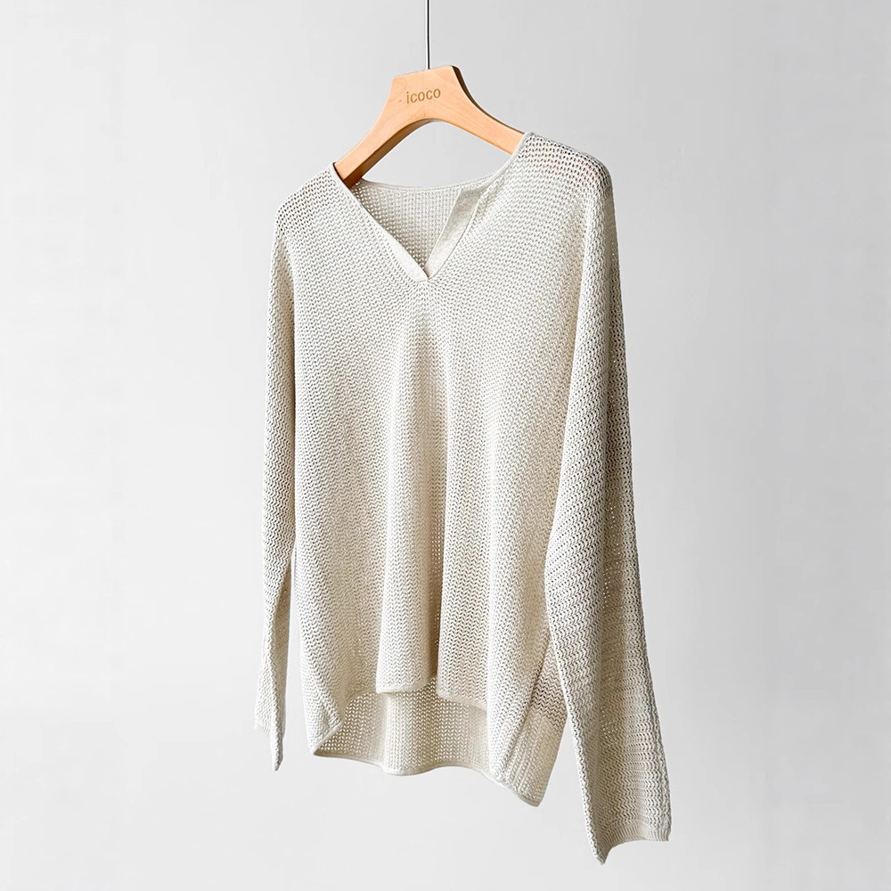 リアルz~y素材~ハイカウントシルクとリネンのブレンド!ゆったりとした中空の質感の長袖Vネックセーター 25年春夏