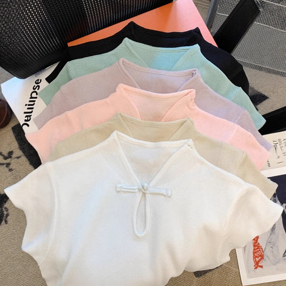 夏の婦人服の新しいスタイルのスリムフィットの新しい中国風のクロップドトップス、ボタン付きフライングスリーブ、ショートセータートレンディ