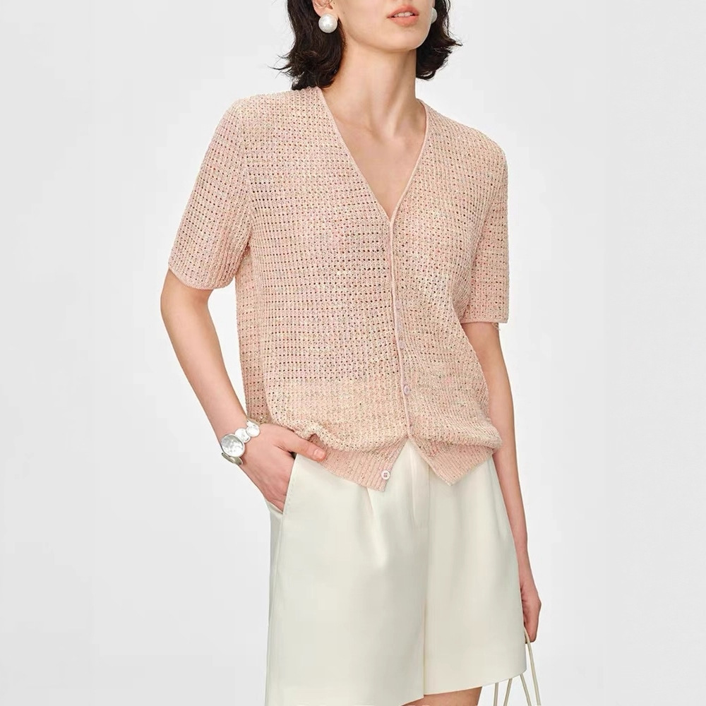 ハーバライフ スパンコール ガーゼ リネン コットン リネン レディース V ネック 半袖 ニット 夏 中空スパンコール カーディガン トップス 女性用
