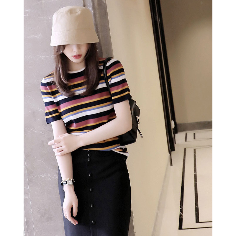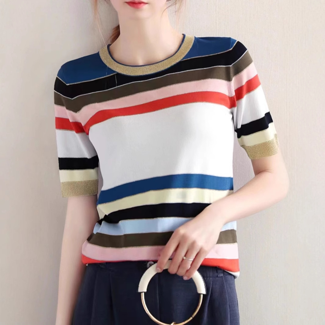 夏の新コントラストカラーストライプアイスシルクセーター女性の半袖気質ラウンドネックマルベリーシルク Tシャツトップ