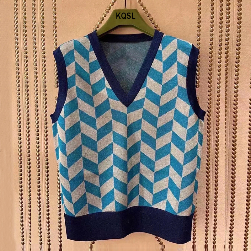 スターの同じスタイルのレトロな金銀糸メタルグリッターブルーチェック柄ジャカードVネックセーターベスト女性用多用途ベスト