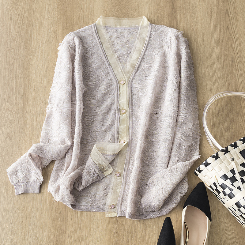 一目で優しい!エレガントでフェミニン!女性用のエレガントでフェミニンなデザインのくり抜きゴールドワイヤーデザインニットカーディガンジャケット