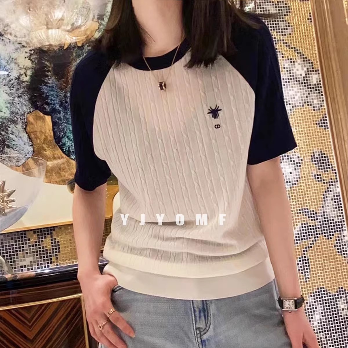 Little Bee 刺繍ウーステッドウールニット半袖レディース薄手プルオーバーラウンドネック 2025 春夏新作スプライシングボトム