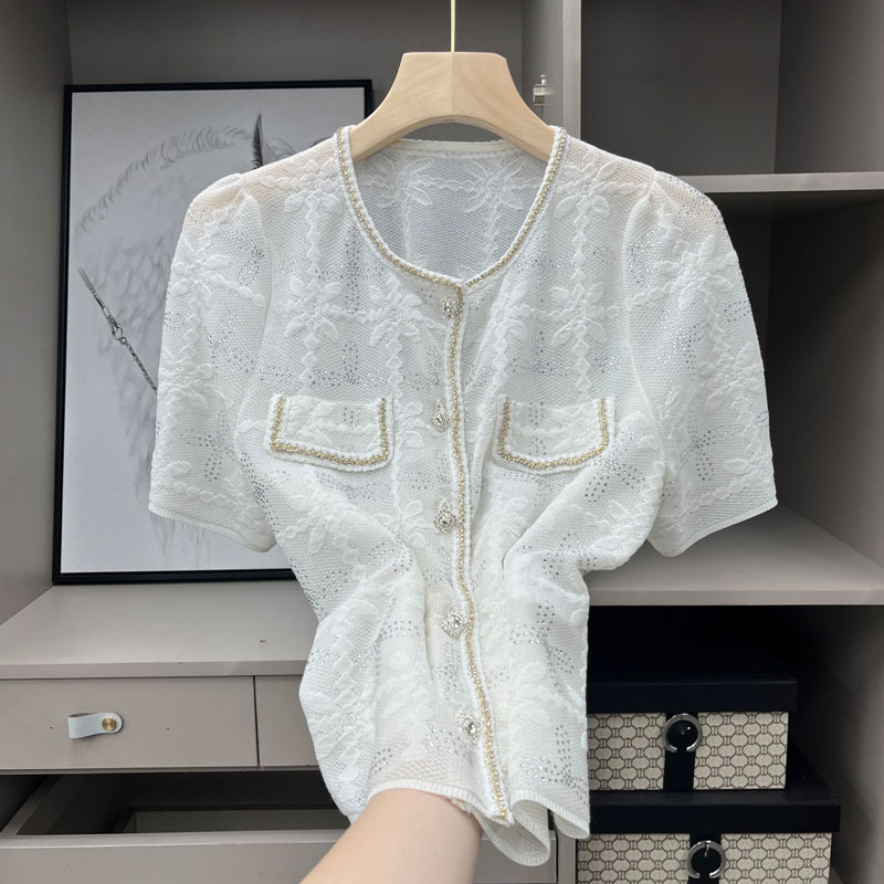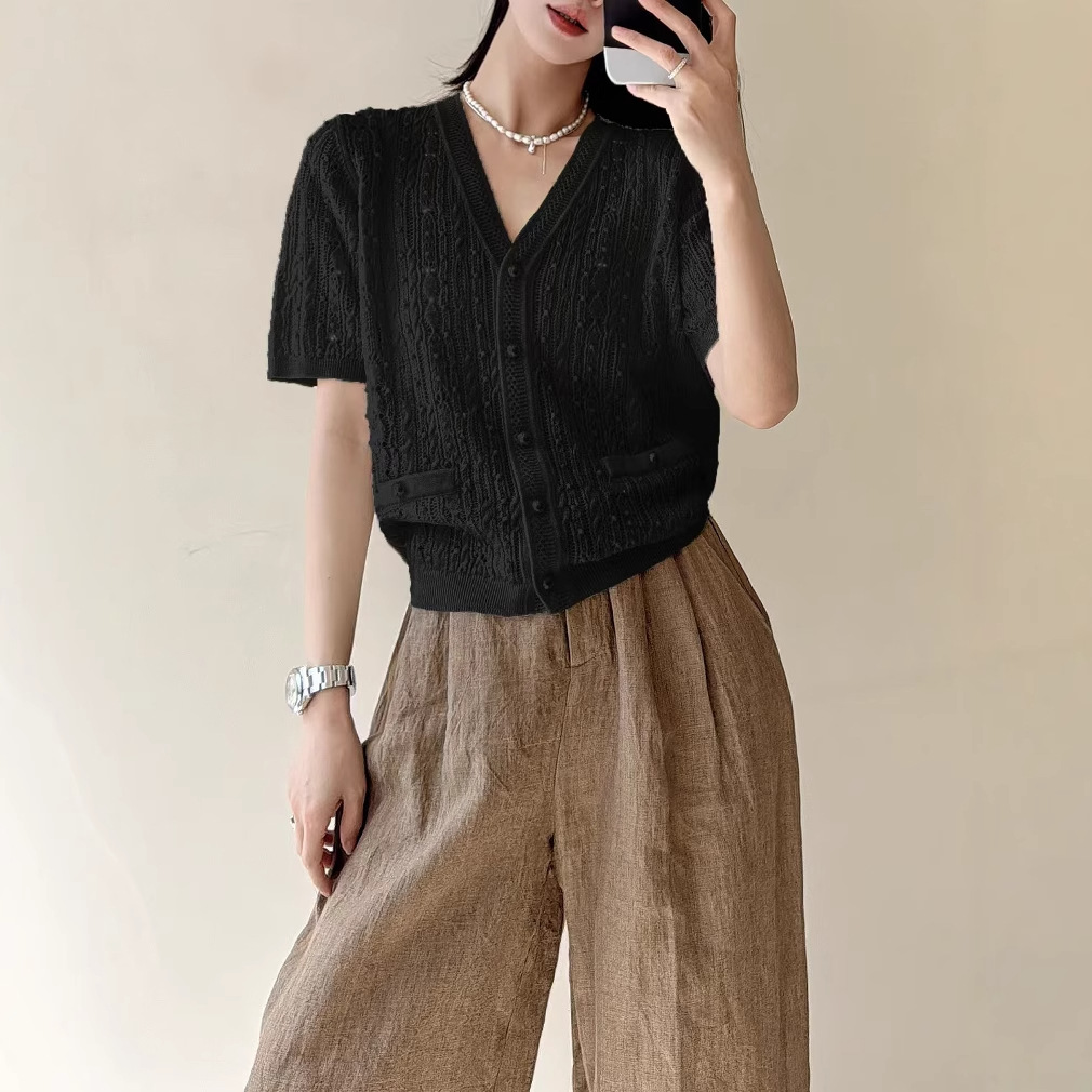 特別オファー、返金不可、交換不可、パールブレスト立体ウェーブボールVネック中空カーディガン半袖ルーズトップ女性用夏