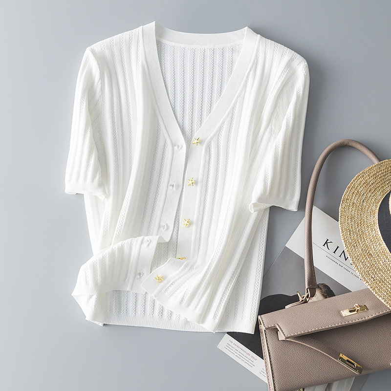 超美品〜フランスのエレガントで絶妙なヒトデボタンネジVネック半袖ニットカーディガンレディーストップス