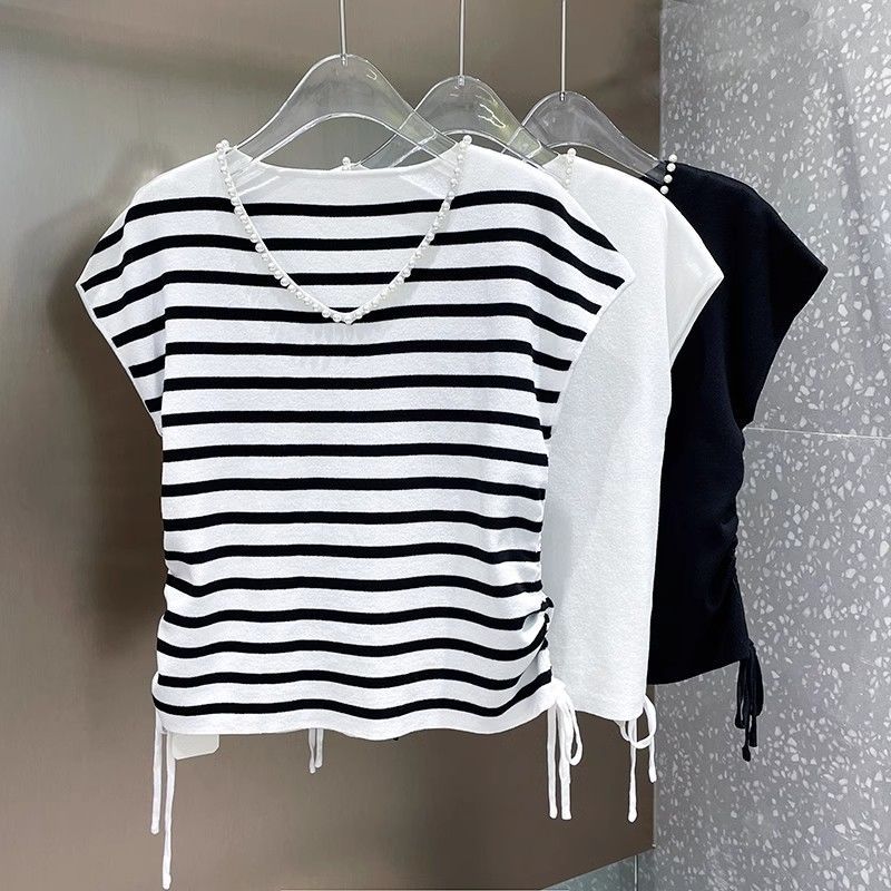 2025 夏と秋の新スタイルネックラインパール V ネック半袖セーター女性の両側巾着デザインウエスト痩身トップ