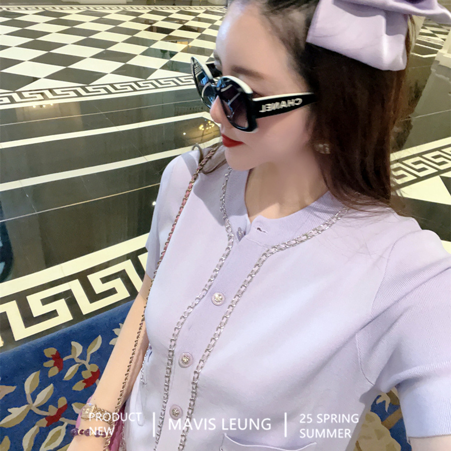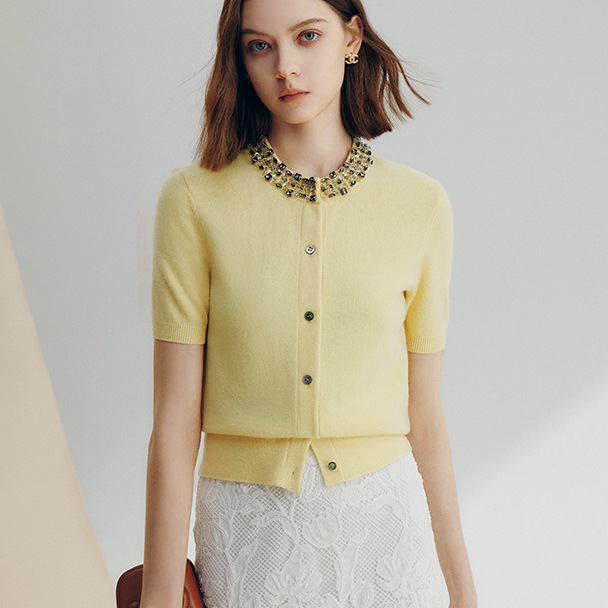 【星ドリルシリーズ】法曼萱フランス黄色小香風釘珠ニットシャツ2025夏新気質上着