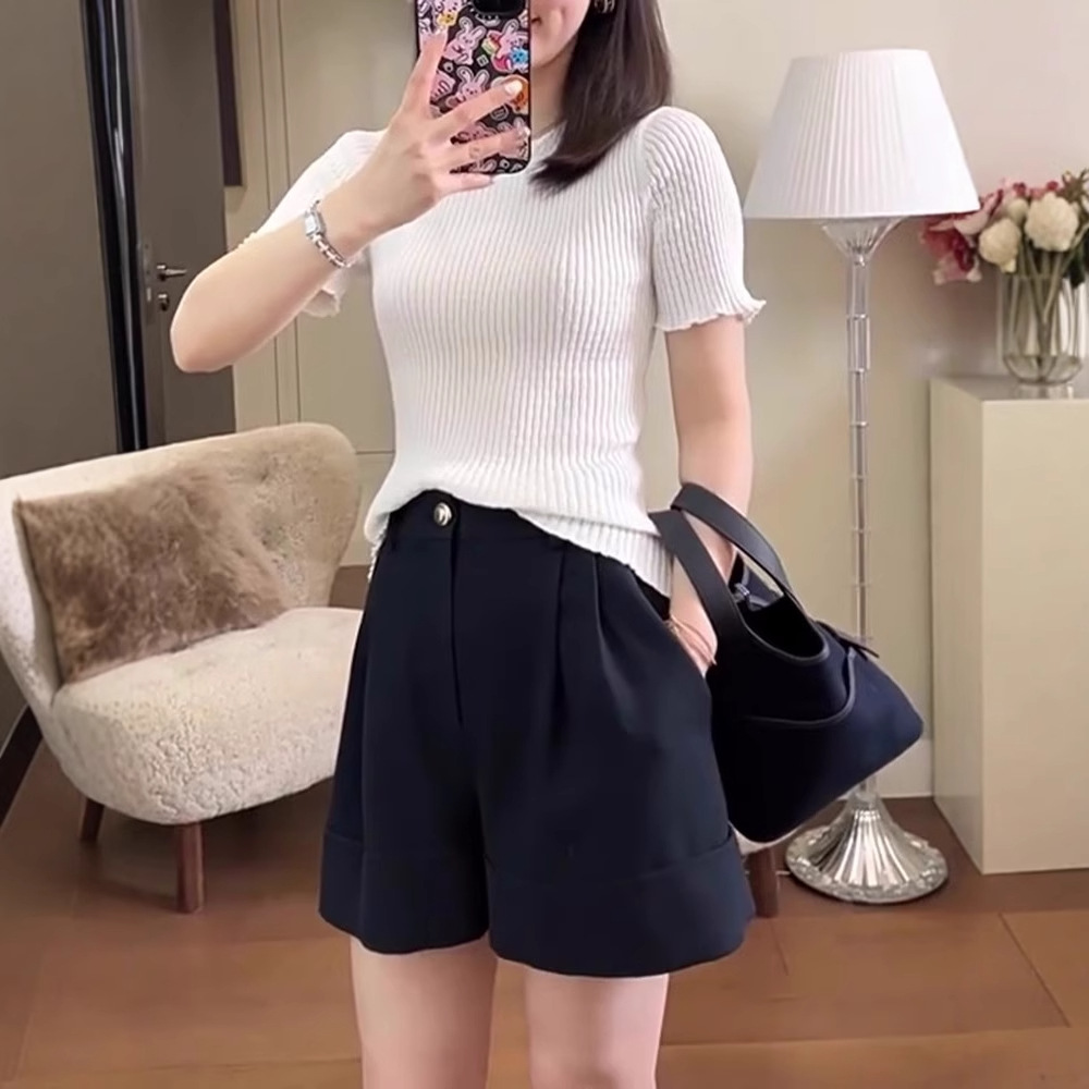薄手のアイスニットUネック半袖女性白黒ストライプが色の短い上着にぶつかって、夏の高級感があります。
