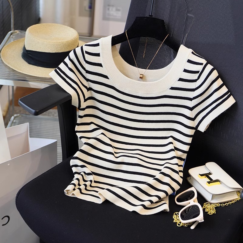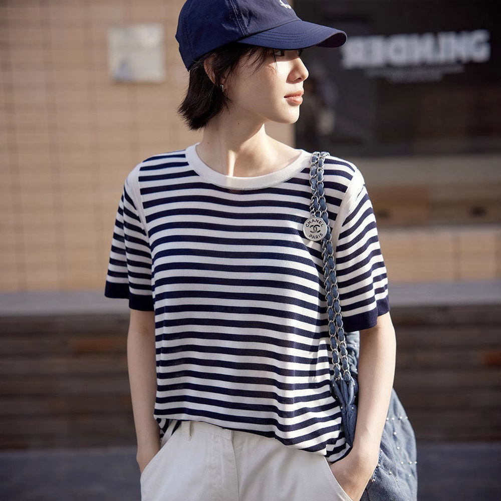 薄っぺらな通気性のあるストライプのカジュアルな半袖tシャツの女性2024夏の新型のゆったりしたカジュアルなコンビネーションのシンプルな丸首の上着