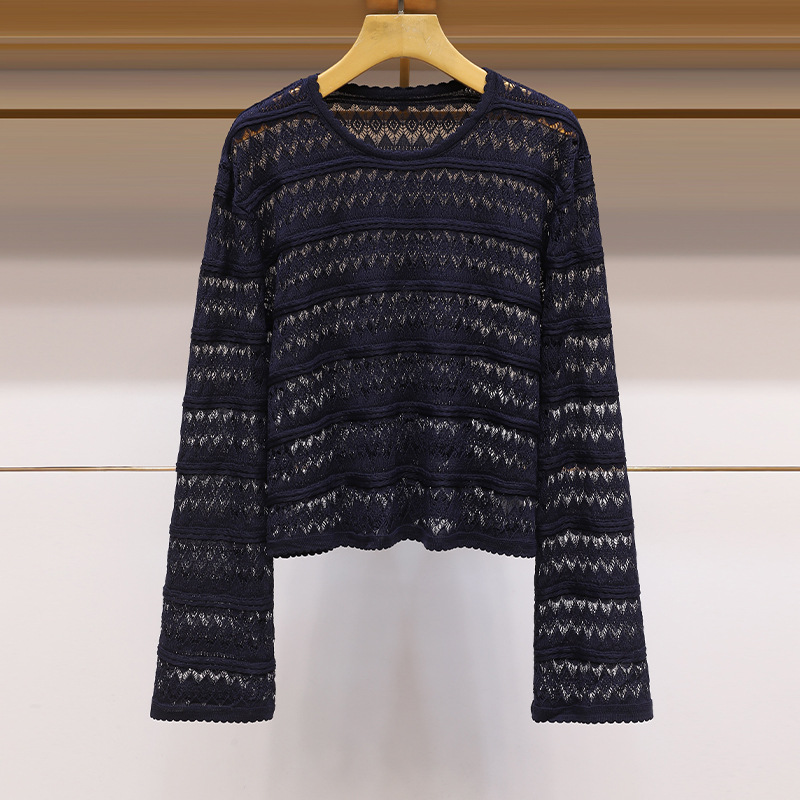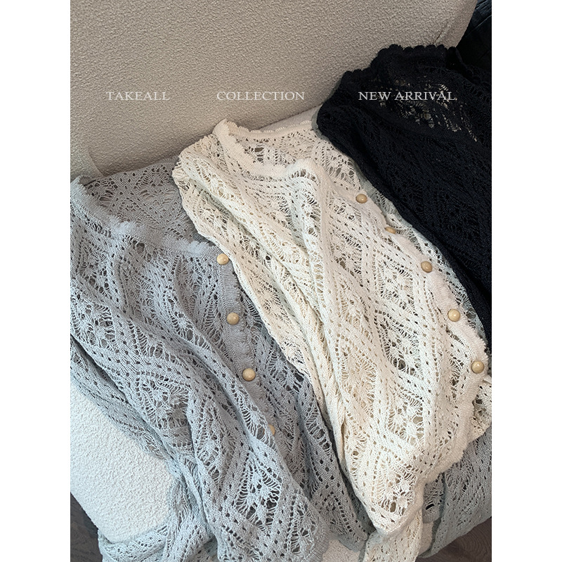 透かし彫りのブラウスの上着の2025新型の丸首の長袖の通勤日焼け止めのハイエンドのフランスのレースのフックのニットの女性