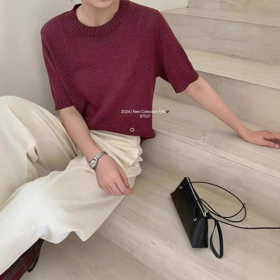 サンデーmerryはジャカード編みの蓮の葉の縁飾りの半袖のニットの上着の女性を引き出して丸首のtシャツを修理します。