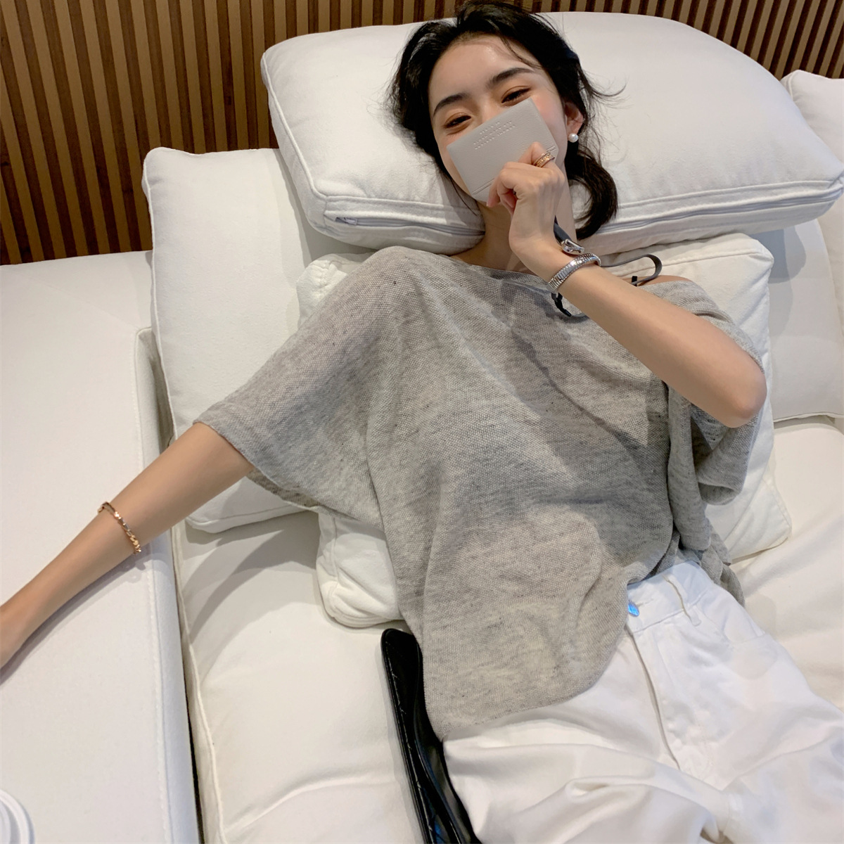 COKEYA/幻彩羽鱗シャツ ~ 康宝莱亜麻珠片ゆるいvネック半袖ニットカーディガン女春夏