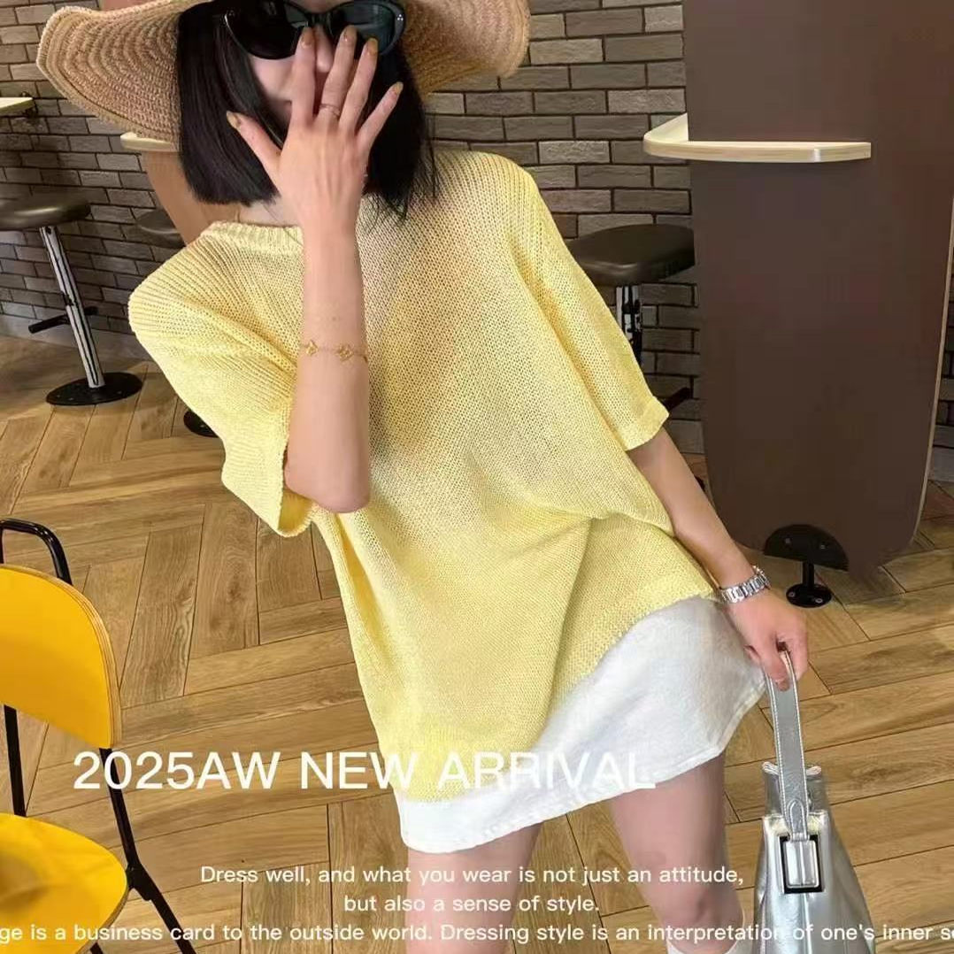 ヨーロッパ商品2025年夏新作ファッションシンプル丸首純色ゆったりとした着痩せ輸入和紙糸半袖上着