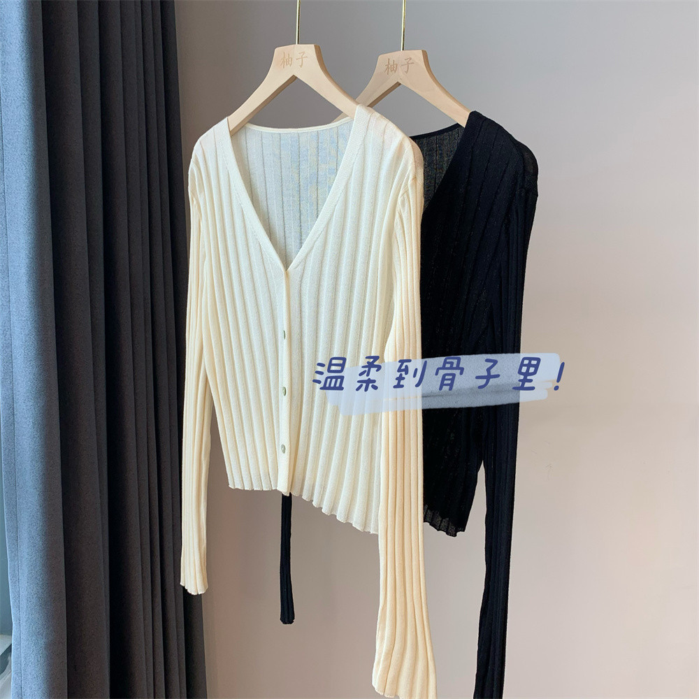 骨の深さまで優しい〜繊細で滑らか、軽く通気性のあるVネックのリブ編みエアコンシャツ、着痩せ効果のあるショート丈ウールカーディガン(女性用)