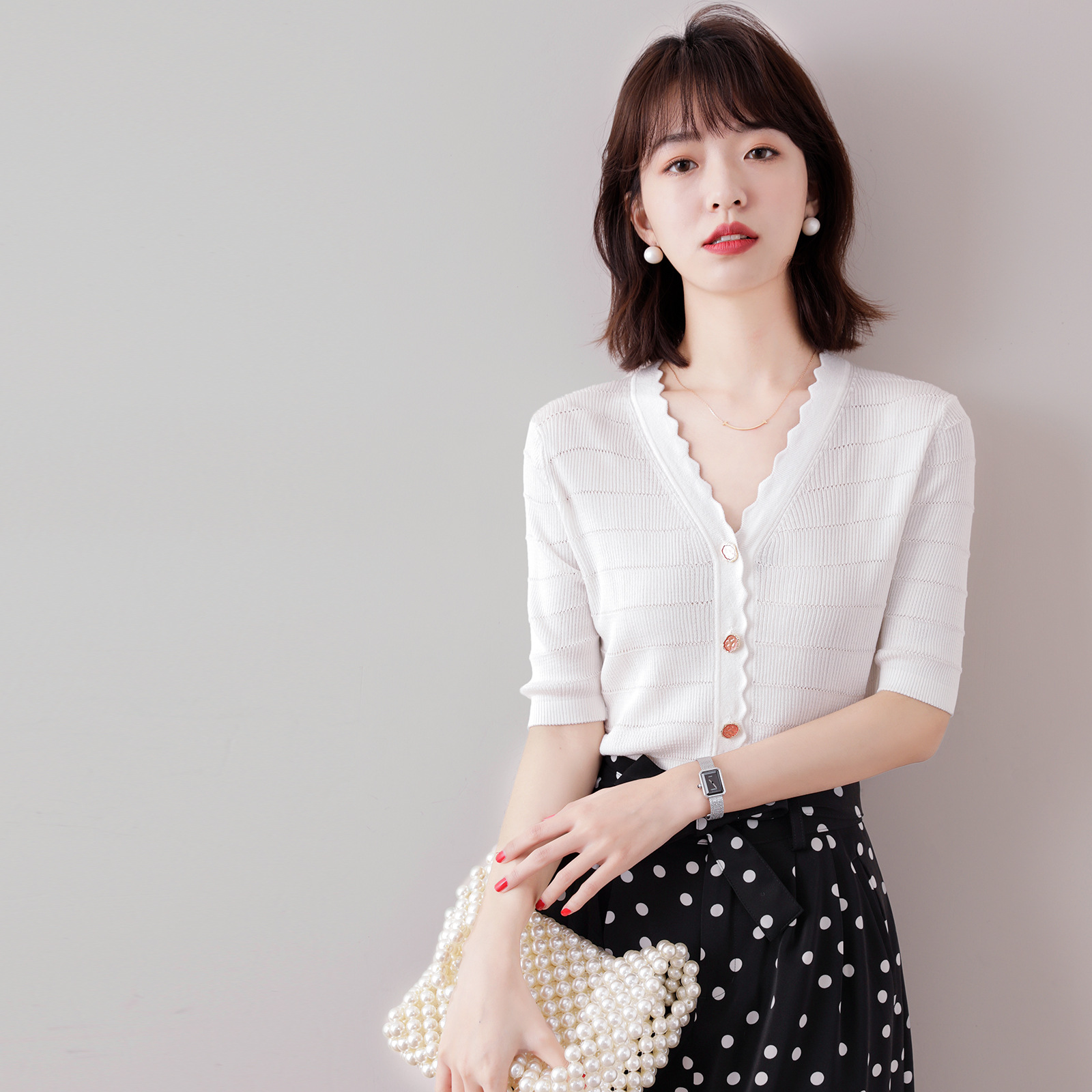 香港米【良い品質でリピーターをする】夏のレースvネック単列ボタン純色半袖ニット