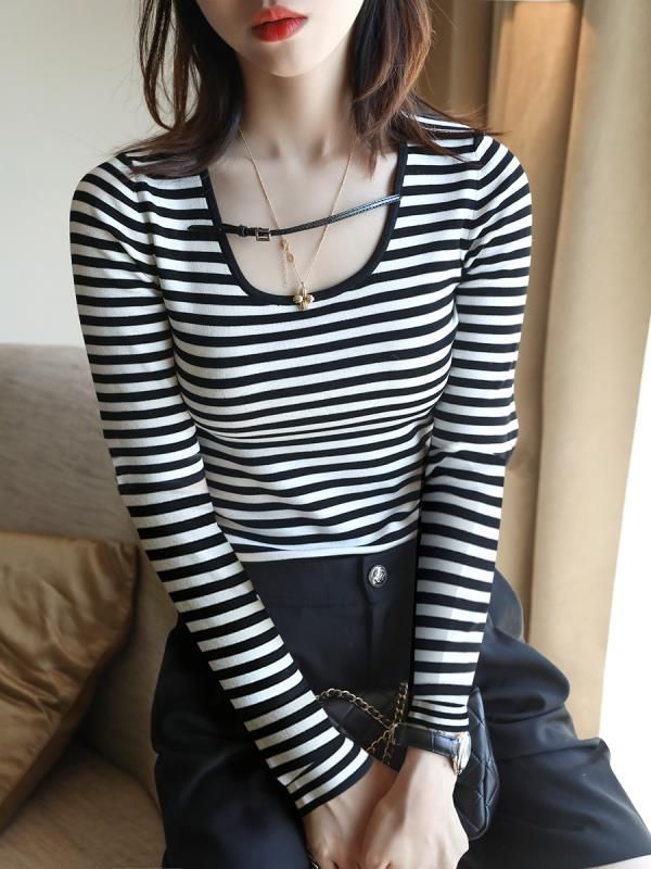 シンプルなデザイン感が色のストライプの長袖tシャツにぶつかります。