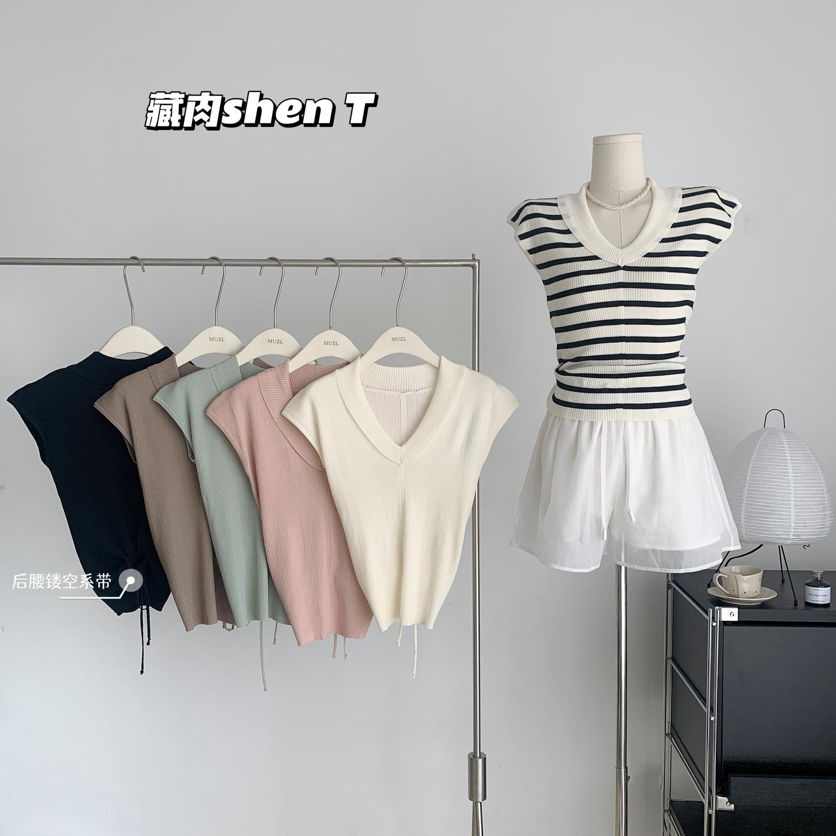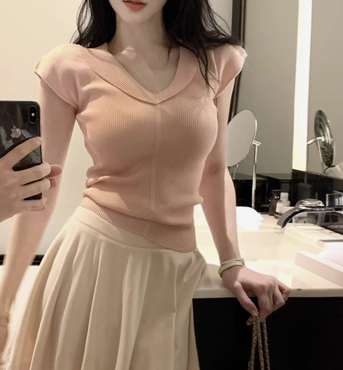 230619気質の優しい風vネックニット半袖tシャツ女性の新商品