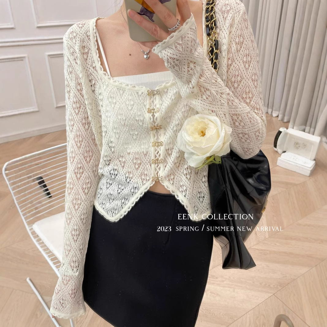 25 新しいフランスの優しいロマンチックなレース中空ニットカーディガンブラウス空調シャツ日焼け止めシャツトップ薄い