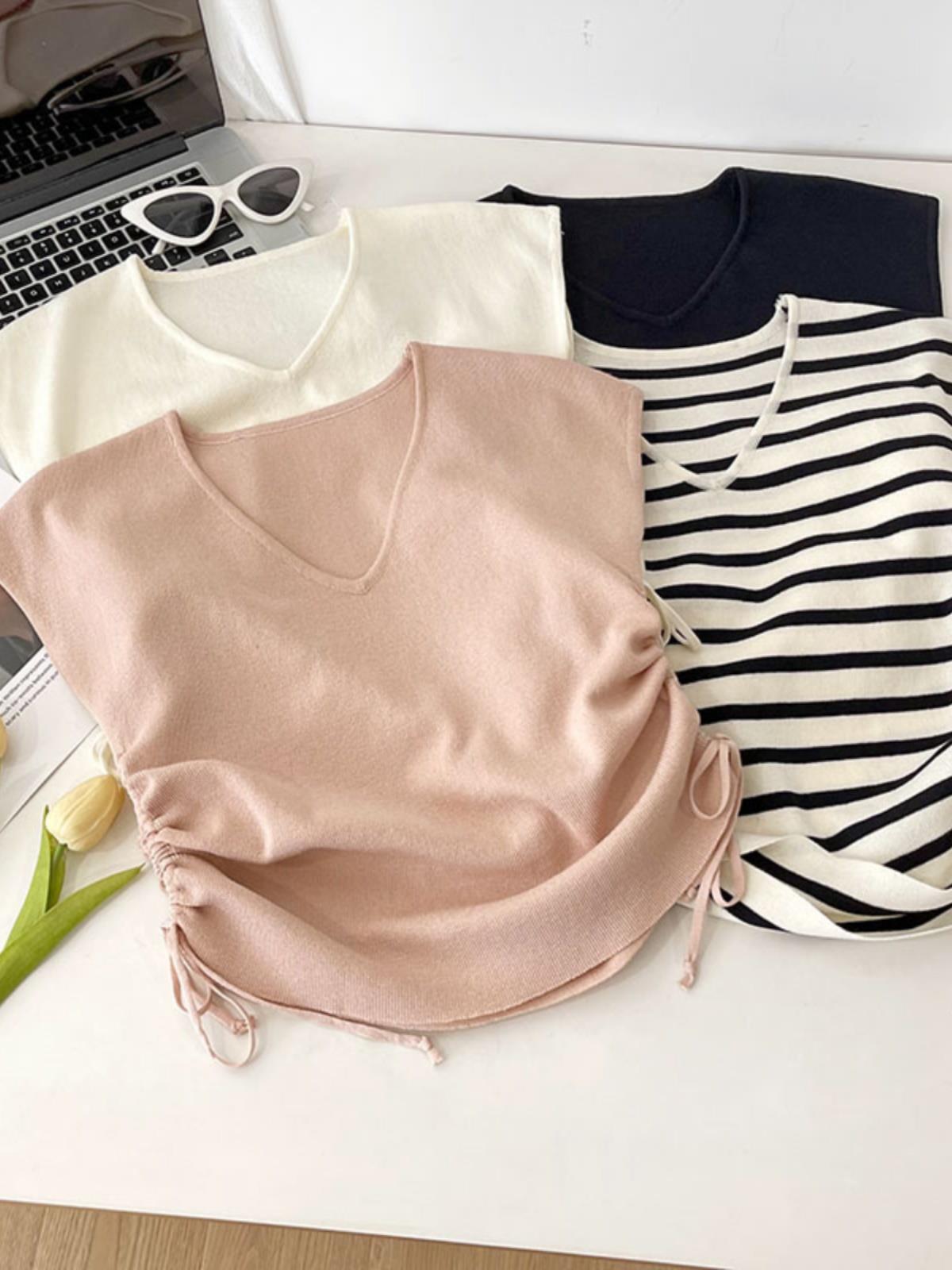 Rena気質シンプルで甘辛風vネックの露骨な両側の紐を引きます。