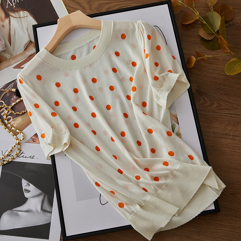 細いウールは欧米の外国貿易の元のolの高級な気質の通勤の波点の半袖のニットの底のシャツのtシャツを輸出します。