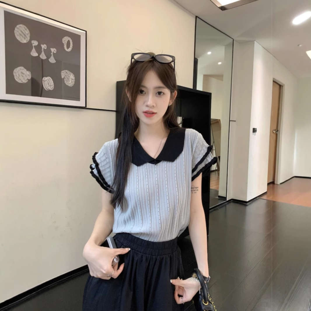 フランスの波の辺は色の半袖のメリヤスの女性の夏の新型の復古のデザイン感にぶつかります。