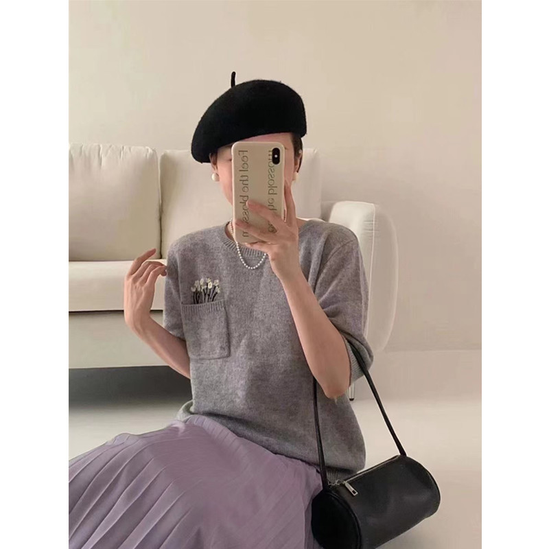 港米2022早秋の新型丸襟五分袖ポケット手作り花ニット全ウール韓范小シャツ女