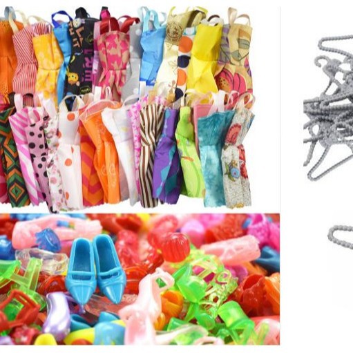 40pcs人形部品10枚のスカート + 10個のバッグ + 10ハンガー + 10足のハイヒール靴がランダムに135g発行された