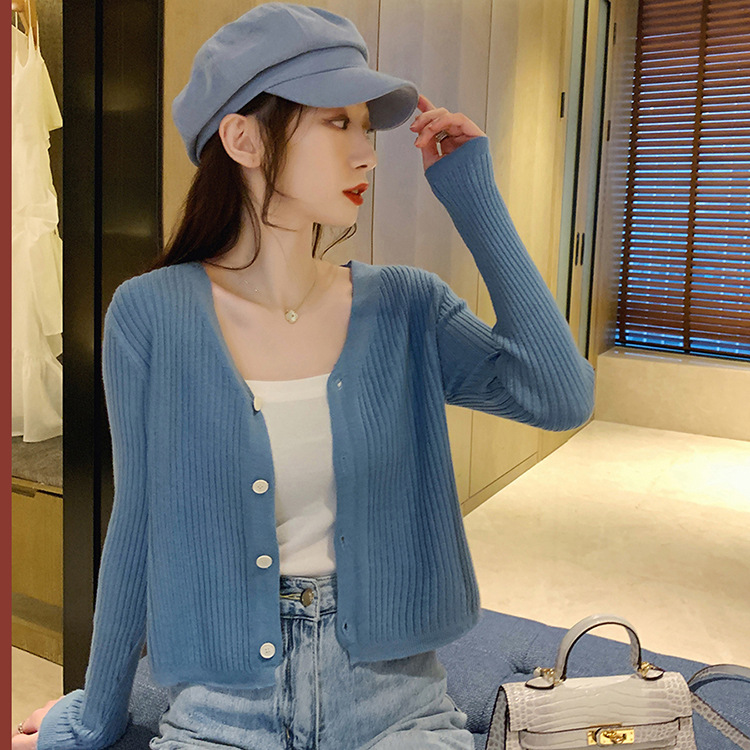 フランスvネックニットカーディガン女性ハイウエストのショートモデルのラッパ袖の外に2023新型の婦人服のニットの女性のコートを掛けます。