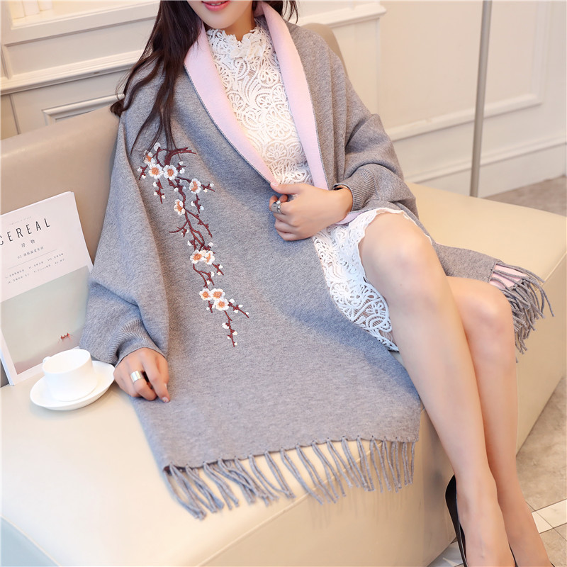 ストール秋装2022新型女装梅刺繍袖付きミディアムニットカーディガン女性コートマント
