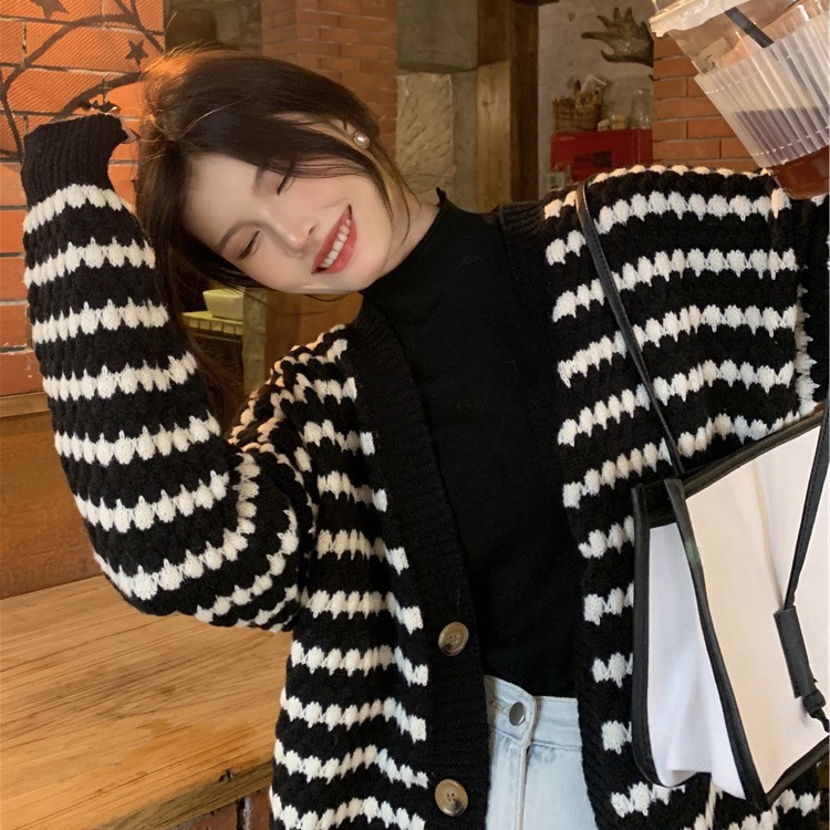 韓国版学院風ストライプ丸首ニットカーディガン女性2022新型秋服ゆったりとしたショートセーターのコート