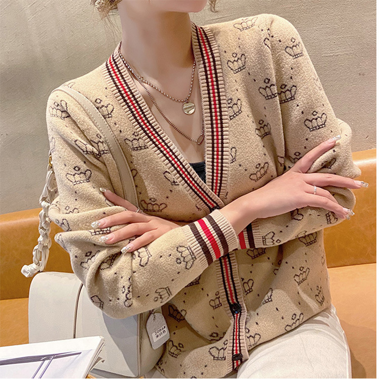 韓国版のニットの洋風の小さい香りの風のコートの女性の秋の服の2022新型のvネックのゆったりしているカーディガンのセーターの女性の上着
