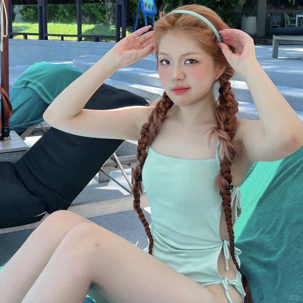 新型韓国温泉水着清新少女小香風セクシーインスタ風透かし彫り蝶結びワンピース水着