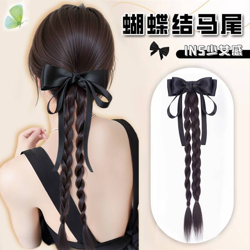 ウィッグ三つ編み女性のハイポニーテールクリップ人工毛リボンダブルツイストロング三つ編みヘアアクセサリー新しい中国風のポニーテールウィッグ