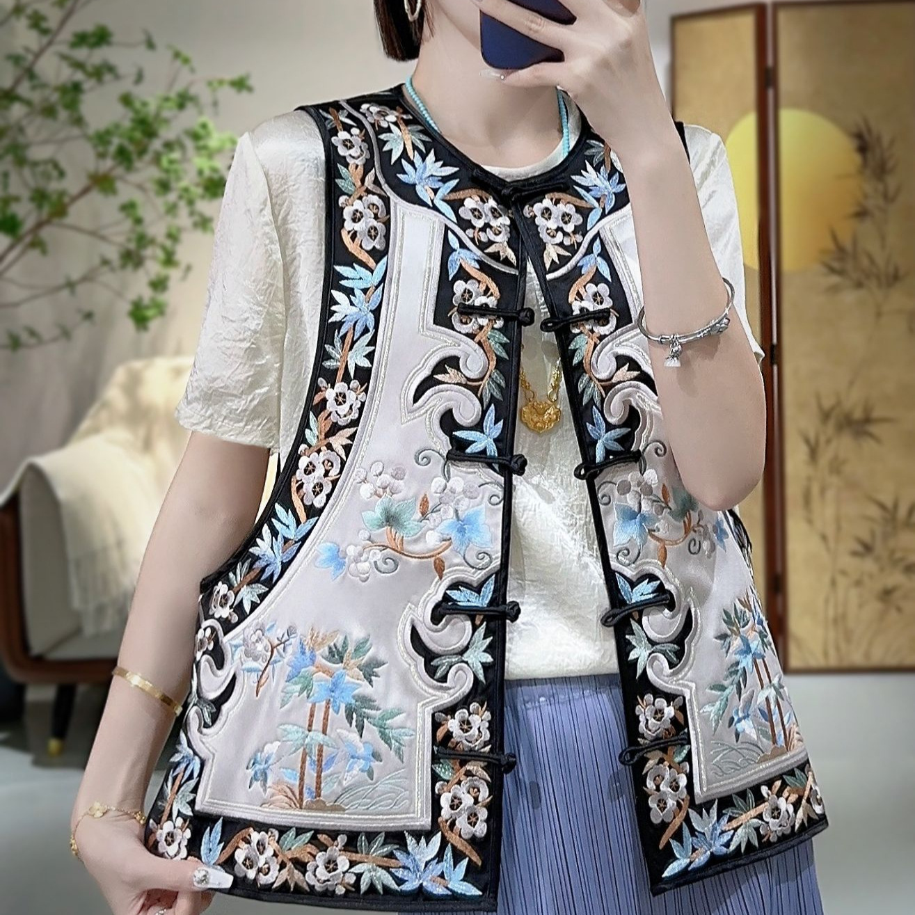 2024蘭汐夏の新型中国式重工満刺繍花鳥刺繍立襟斜襟酢酸小馬甲