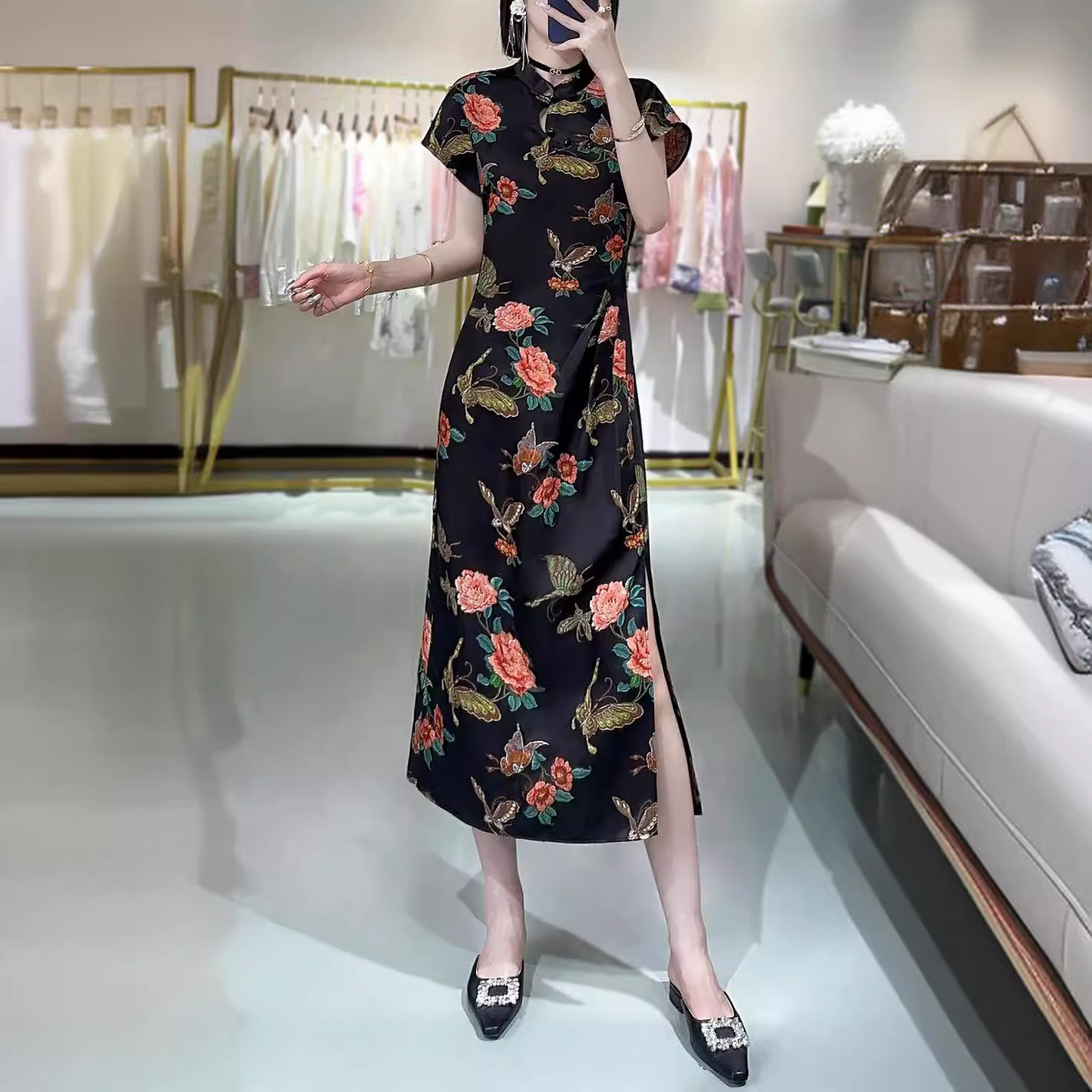 蘭汐夏の新型中国式バタフライ恋花全人糸香雲紗改良旗ガウンスカート