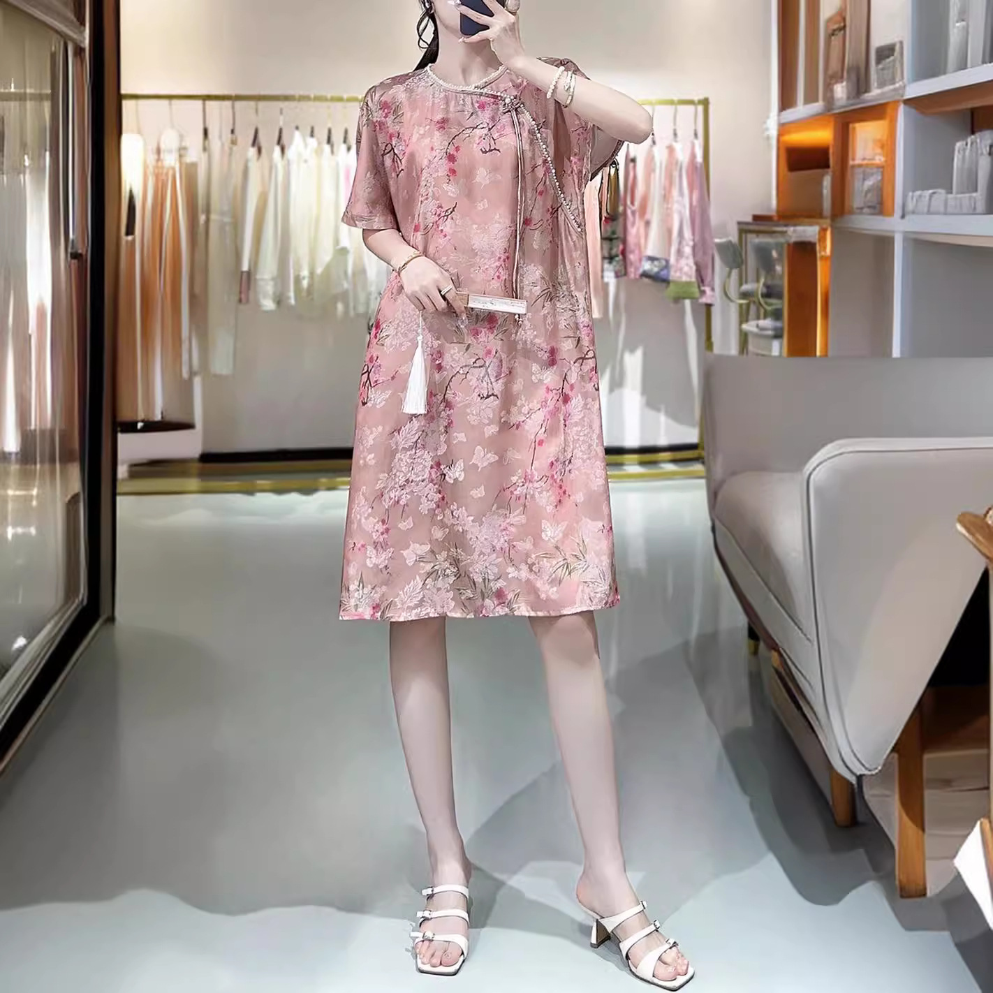 夏の新型中国式レトロ花刺繍ゆるい丸首チャイナドレス