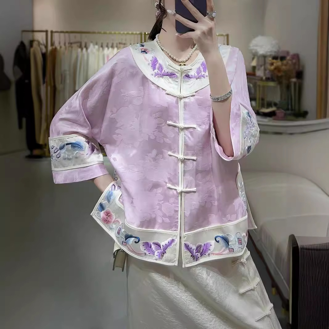 2024夏の新型中国式蝶恋花シルクジャカード刺繍対襟小上着