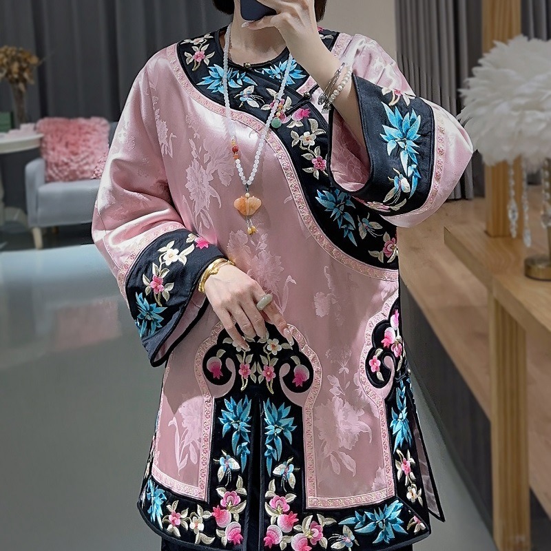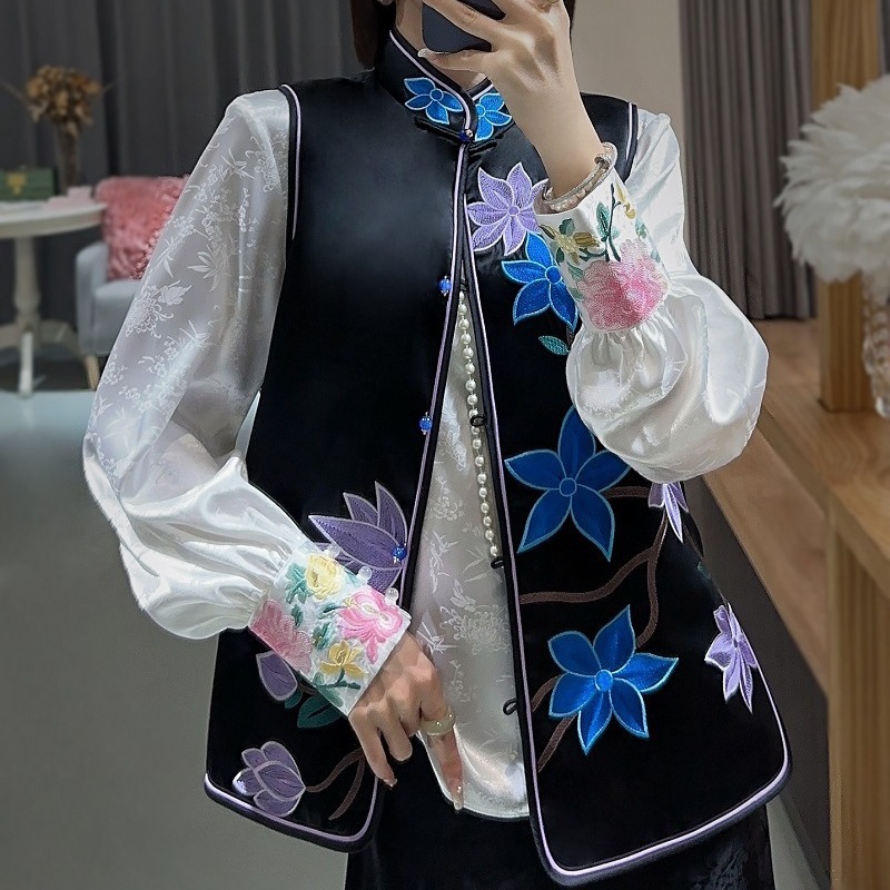蘭汐の新型の中国式の花の刺繍の対襟の酢酸の丸首の小さい馬の甲