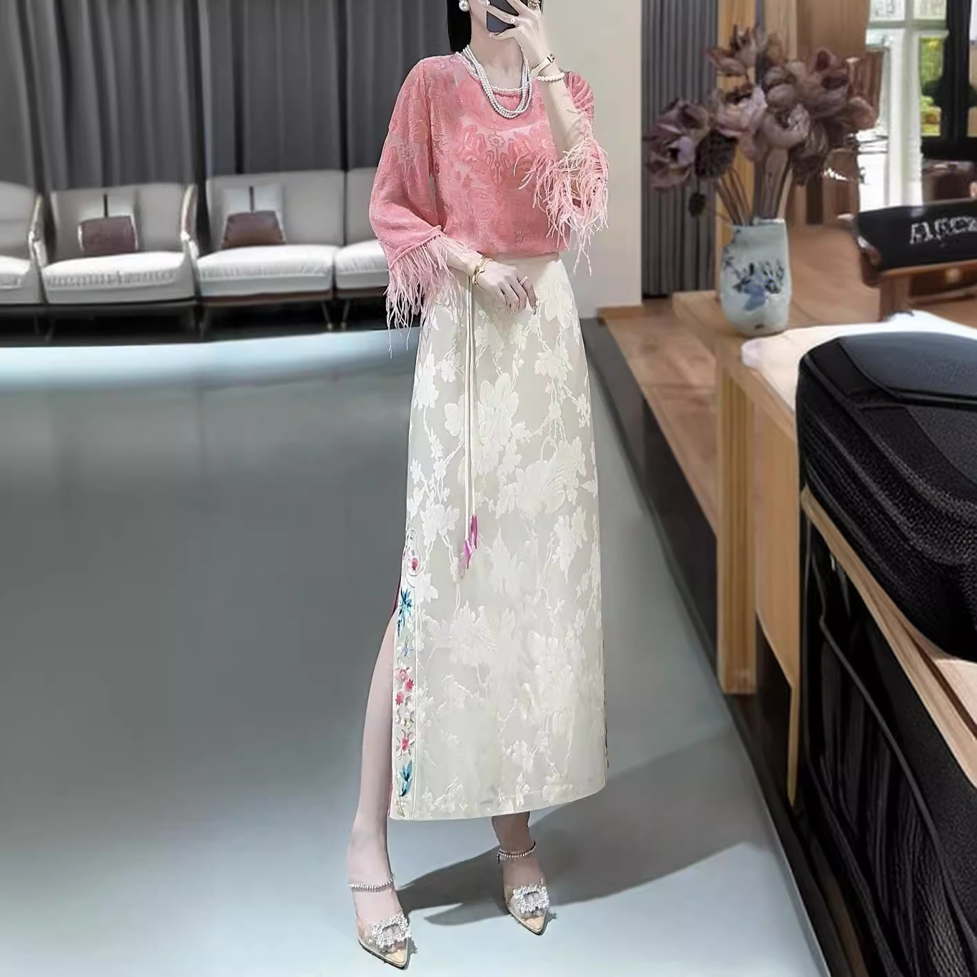 新型中国式乱花ベルベット百合花半スカート (後ろにスリットポケットがある)