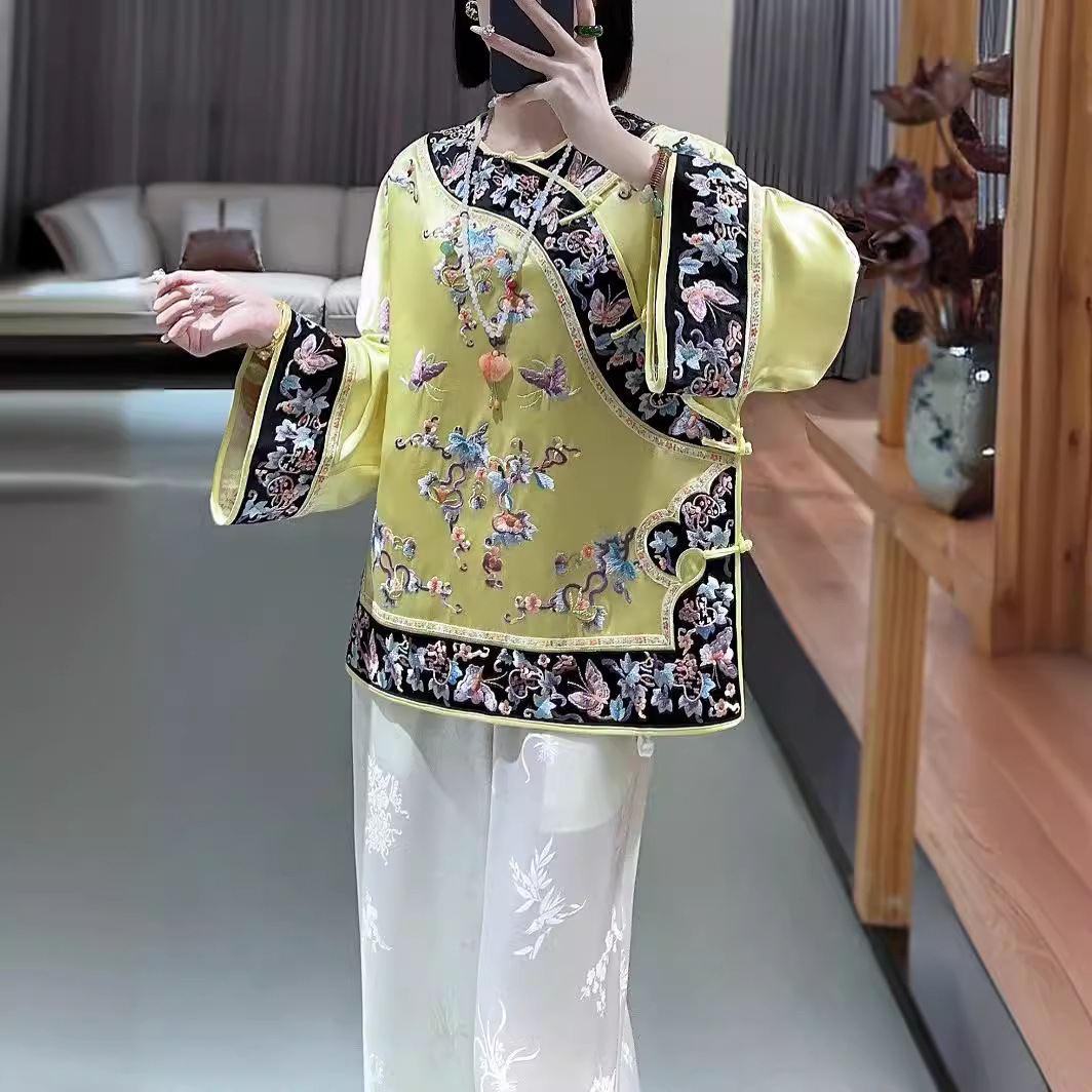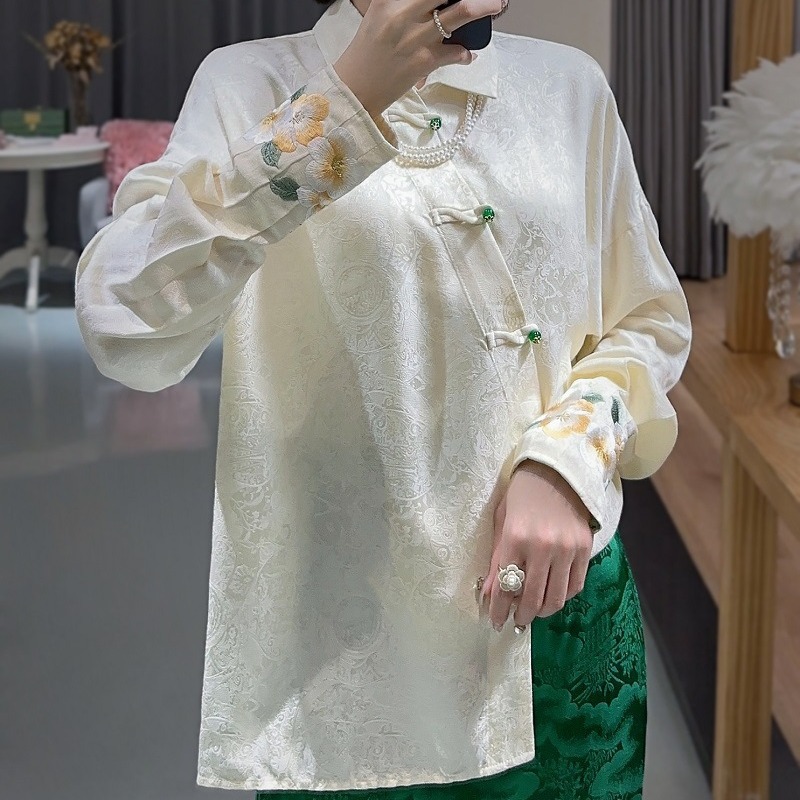2024春の新型中国式花刺繍シルクサテンジャカードシャツ