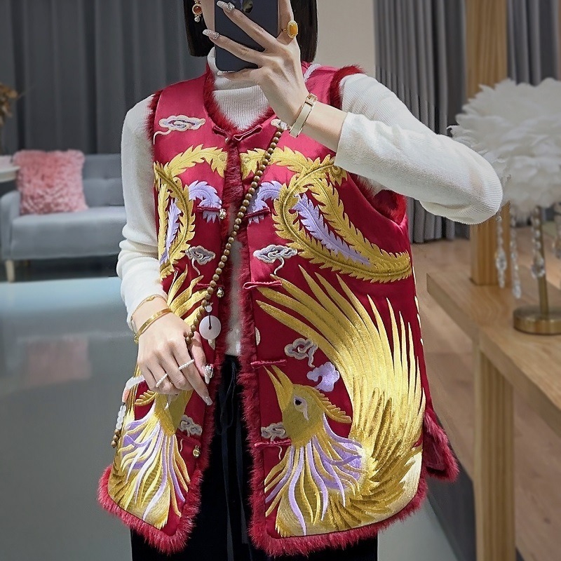中国式鳳凰は重いポンドの酢酸の丸首を刺繍して綿を挟んでミンクの毛の綿のベストをはめ込みます。