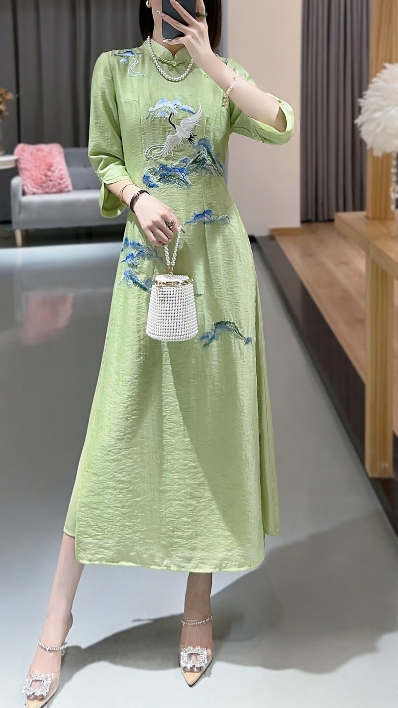 蘭汐の新型中国式千里江山刺繍天糸ジャカードオーダイのチャイナドレス