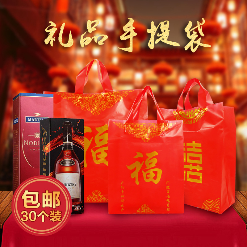 プレゼントの袋は結婚祝いの赤い福喜の字の高級な手提げの袋に酒の中の大きいサイズのビニール袋を入れます。