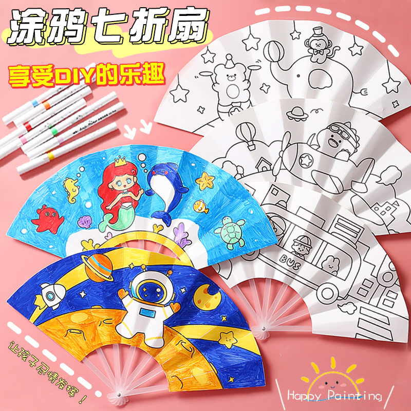 子供手作りdiy落書き扇子絵画七つ折り扇子かわいい漫画着色扇子幼稚園手描き扇子