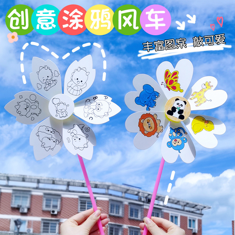 手描きdiy風車子供手作り材料包落書きアウトドア親子活動手持ち風車玩具